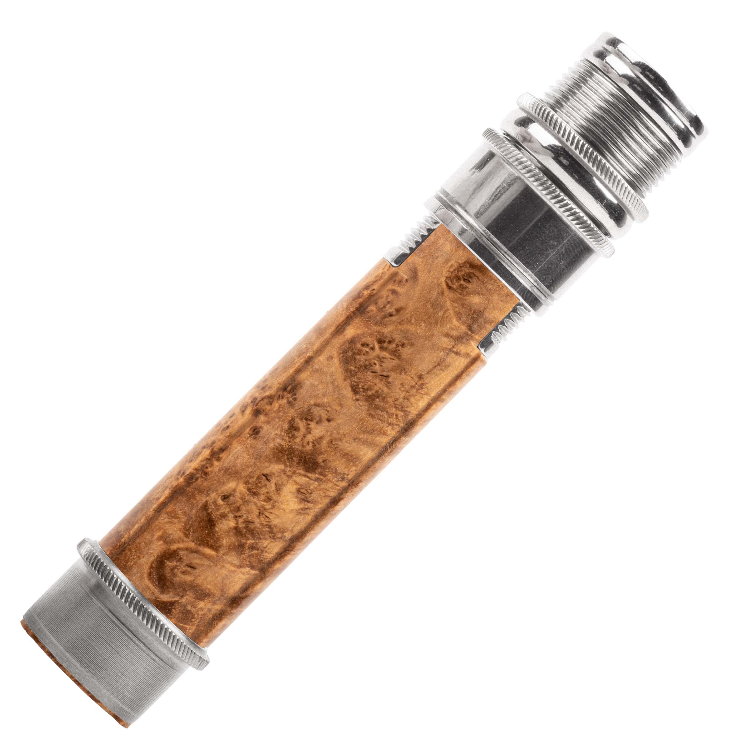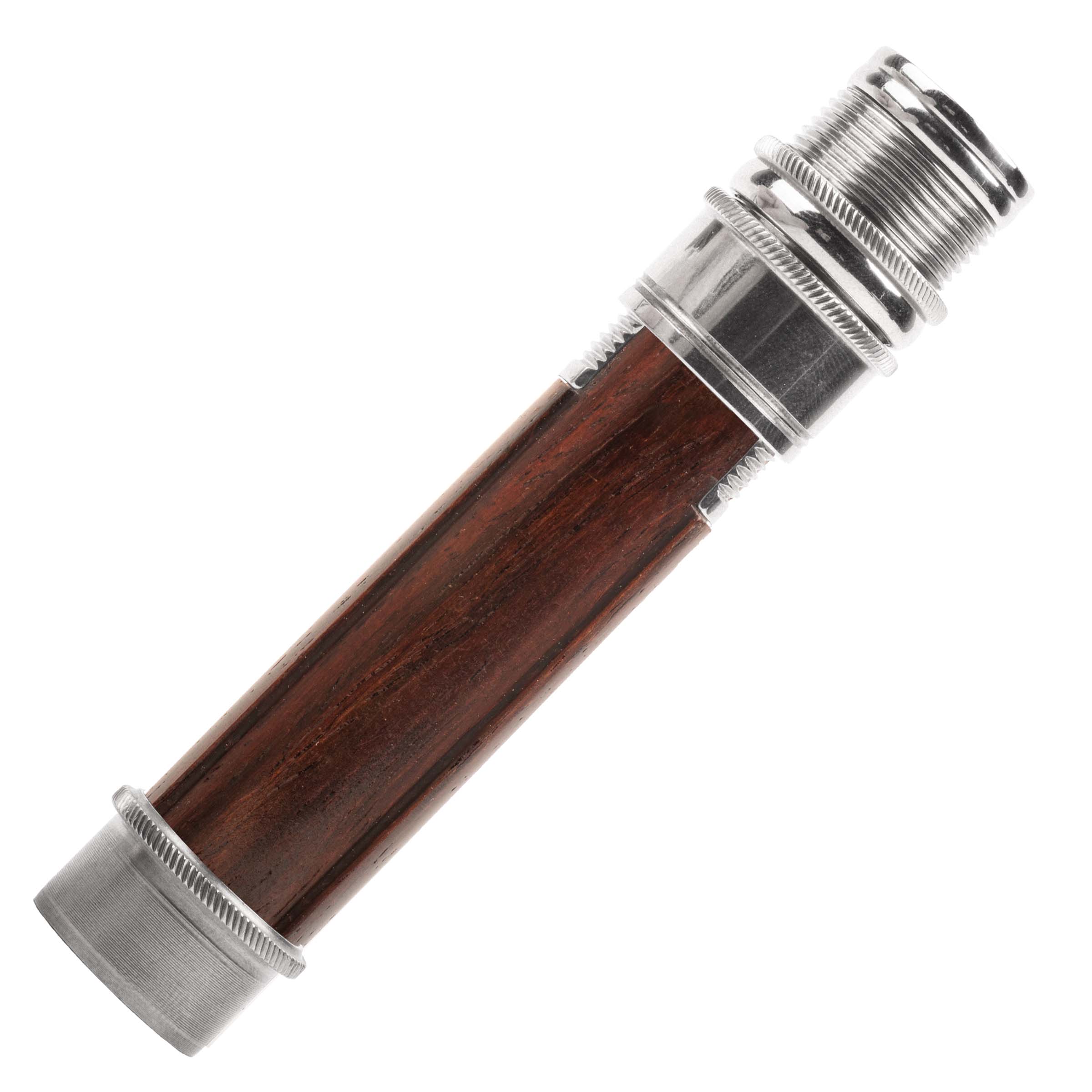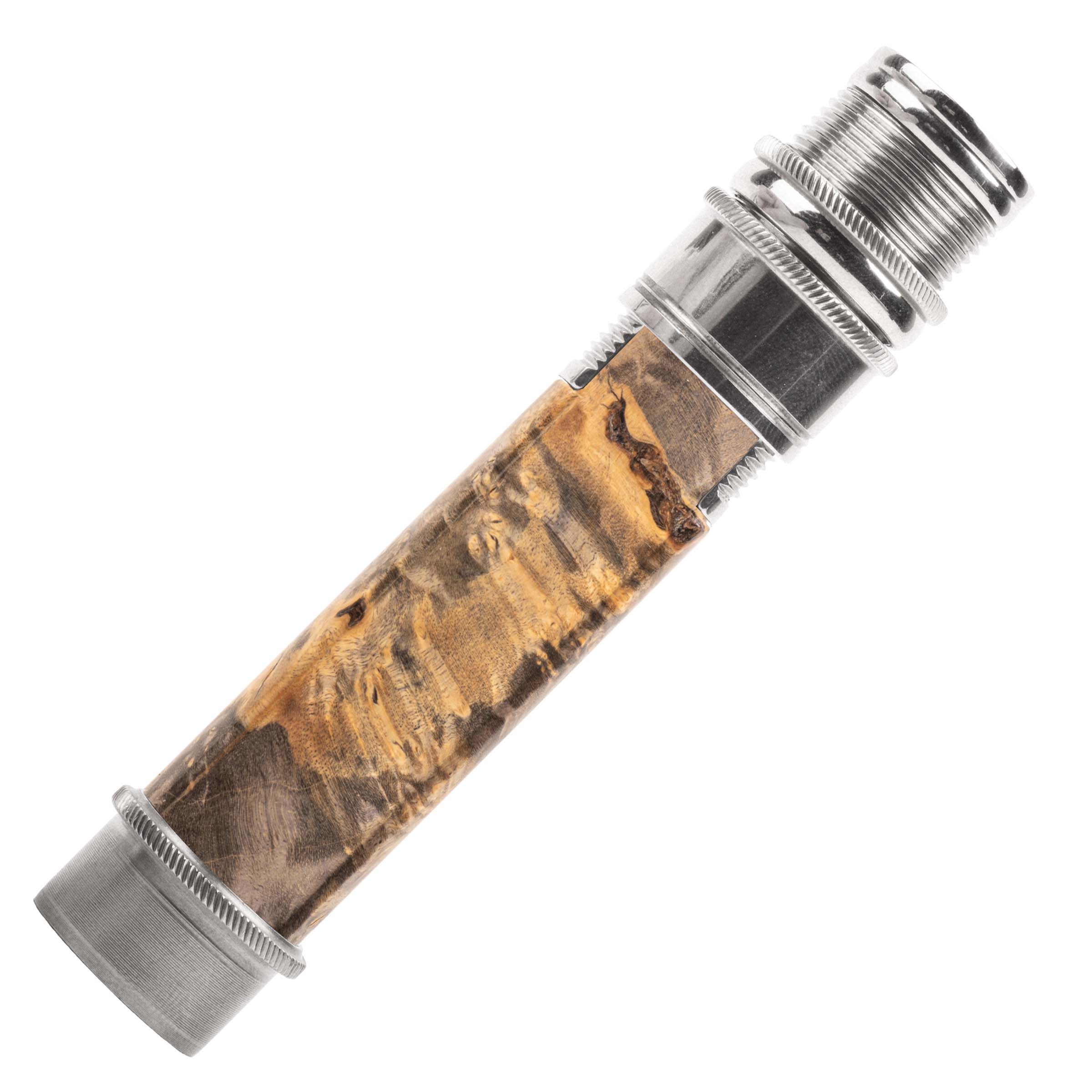 Our "signature" reel seat and one of our most popular models. Uplocking design with skeleton barrel featuring a trim band, special butt cap, knurled nut, knurled slide band with fine trim lines, and knurled fixed hood/cork check, and mortised hardwood spacer.