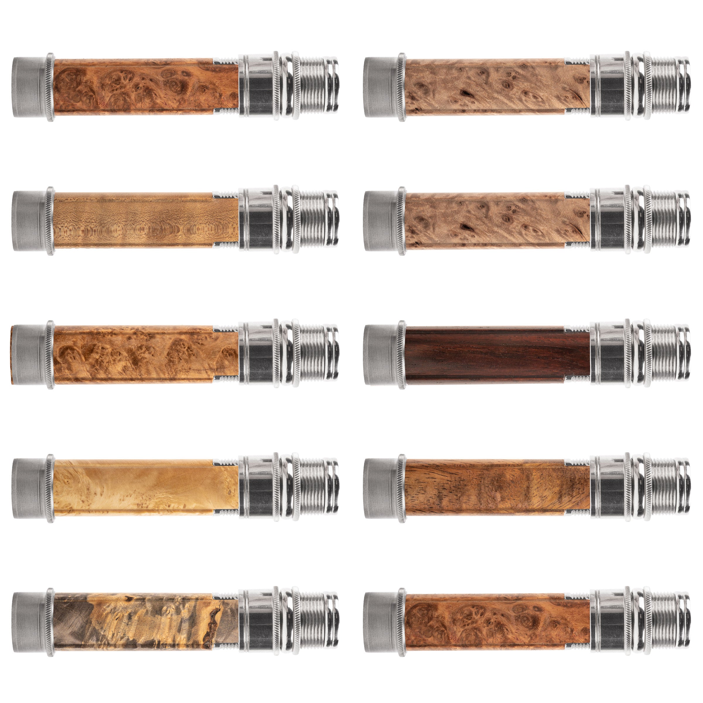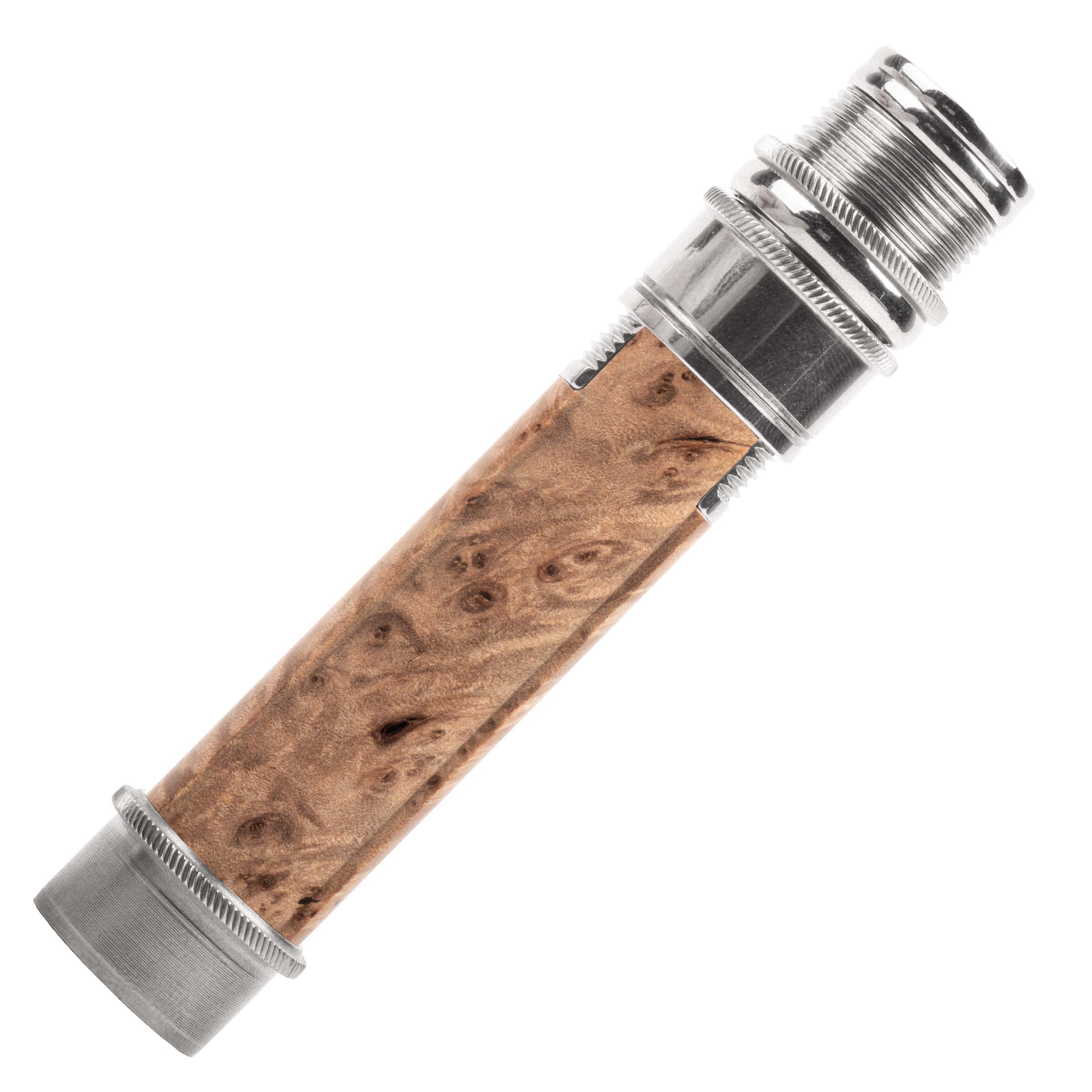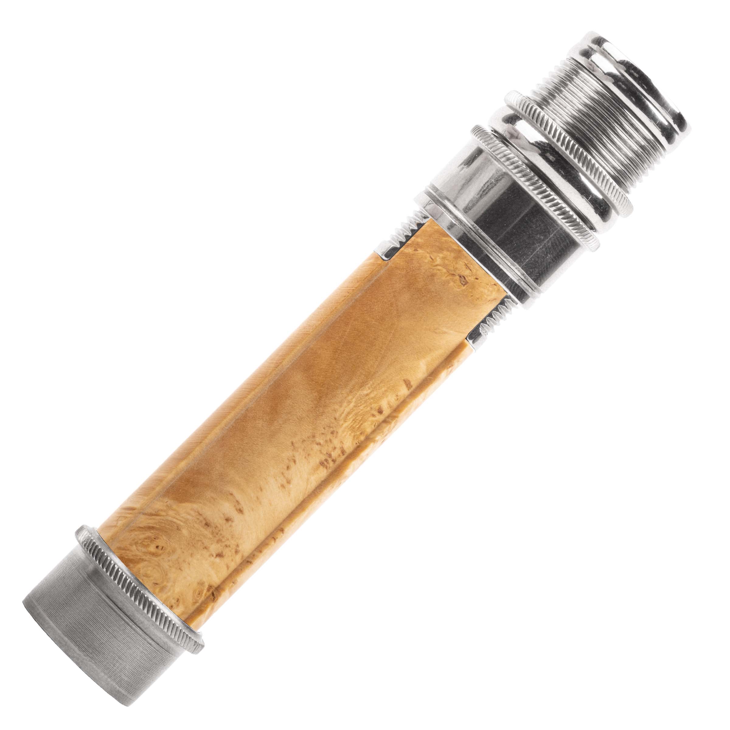 Our "signature" reel seat and one of our most popular models. Uplocking design with skeleton barrel featuring a trim band, special butt cap, knurled nut, knurled slide band with fine trim lines, and knurled fixed hood/cork check, and mortised hardwood spacer.